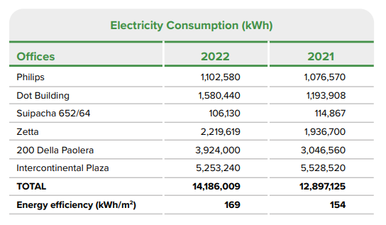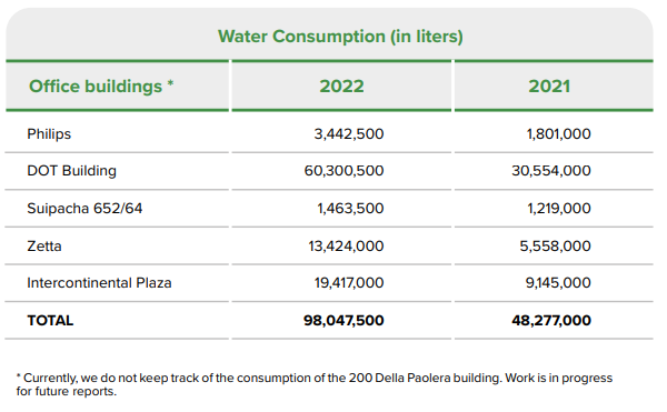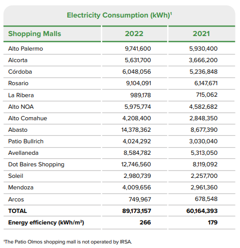 Distrito Arcos is an open-air shopping mall, with plant beds that are irrigated with rainwater. On rainy days, the water is collected in underground tanks and used to 1 For 2021, the reported water and energy consumption data differ from those published in the Sustainability Report due to a change in the calculation methodology. 2 The Company has not been identified as having incurred in relevant non-compliance with environmental regulations in the urban real estate business. In all cases, the Company works together with the national, provincial and municipal control authorities to make the appropriate adjustments in the event that any violation is detected. More information at: https://www.irsa.com.ar/inversores-reportes-anuales-y-anuncio-de-resultados.php irrigate the plant beds on the days when it does not rain. The chosen irrigation system is drip irrigation, as it is highly efficient. In the latest office buildings developed by the Company, 200 Della Paolera and the Zetta Building, rainwater is also used to irrigate the plant beds. In the toilets of our facilities, low-consumption sanitary fixtures and fittings are chosen, through the installation of timers, infrared sensors and aerators, making an efficient use of the resource.