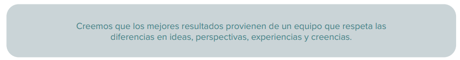 Trabajamos construyendo una empresa cada vez más diversa, que aprende sobre las diferentes miradas y valora la inclusión como un pilar de su cultura organizacional. En nuestra Compañía, consideramos clave generar oportunidades de desarrollo basadas en las competencias y habilidades de cada persona, sin importar género, edad, origen, religión, discapacidad, orientación sexual, ni cualquier otra diferencia.