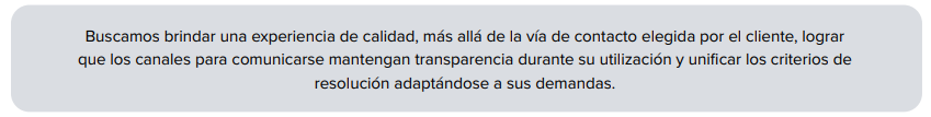 La estrategia de comunicación con nuestra cartera de clientes se integra a través del Contact Center, que brinda el contacto humano y personal en pos de su satisfacción. El Call Center se transformó en Contact Center, para manejar la omnicanalidad, siendo conocedores de la asertividad, la eficacia y el alcance de cada canal y plataforma, y cómo se integra con otros sistemas de la organización. El trato cercano y conciso con clientes brinda a ambos la información y el servicio que necesitan. La relación de confianza se da a través no sólo de ciertos servicios online, sino también del contacto humano por teléfono o WhatsApp, que dará al cliente mayor seguridad, llevándolo a la fidelización. El Contact Center potencia la comunicación bidireccional entre clientes y la organización.
