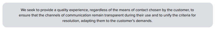 The communication strategy with our customers is integrated through the Contact Center, which provides human and personal contact in pursuit of customer satisfaction. The Call Center was transformed into Contact Center, to manage the omnichannel, being aware of the assertiveness, effectiveness and scope of each channel and platform, and how it integrates with other systems of the organization. The close and concise relationship with customers provides both with the information and service they need. The relationship of trust is not only through certain online services, but also through human contact by telephone or WhatsApp, which will give the customer greater security, leading to customer loyalty. The Contact Center enhances two-way communication between customers and the organization.
